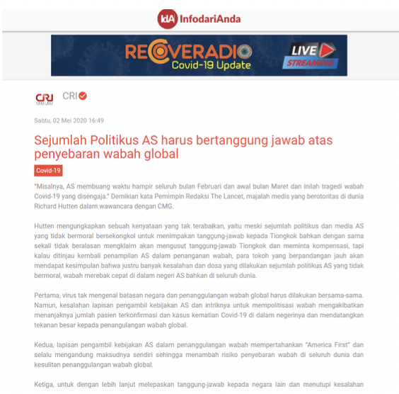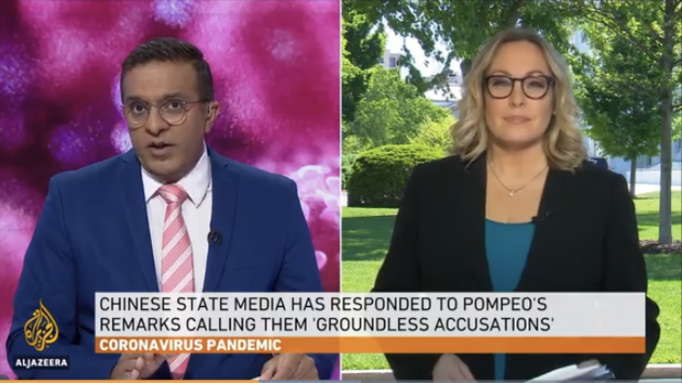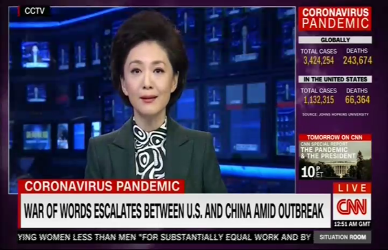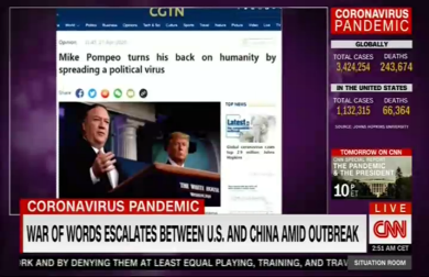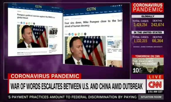 美国有线电视新闻网国内频道(CNN)和美国有线电视新闻网国际新闻频道(CNN International)仅5月1日至3日就连续三天共九次报道称,本周中国中央电视台几乎每天播发评论抨击美国国务卿蓬佩奥对中国的指责,其中有一篇评论指出,“散播‘政治病毒’的蓬佩奥正把自己变成人类公敌。”