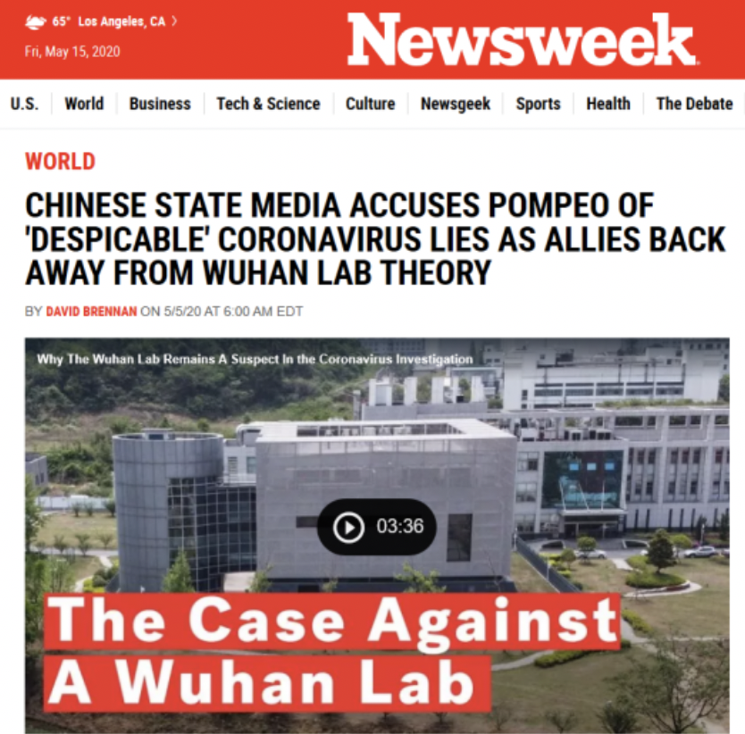 美国《新闻周刊》网站5月5日发表题为《中国官方媒体指责蓬佩奥“卑鄙的”冠状病谎言》的报道。报道称,蓬佩奥声称看到“大量证据”证明该病毒与疫情有关,中国国家媒体愤怒回应了针对该国应对疫情不力以及武汉病毒研究所与疫情有关的指控。
