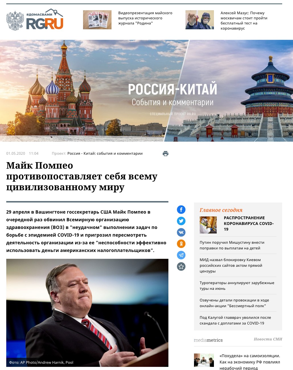 俄罗斯最具权威性和影响力的国家政府机关报《俄罗斯报》官网5月1日发表题为《蓬佩奥与全世界对抗》的文章。文章称,在美国疫情确诊人数突破百万的危急时刻,蓬佩奥不是集中精力为抢救美国公民生命而奔波,而是企图对世卫组织搞政治胁迫,公然站到了全世界的对立面。