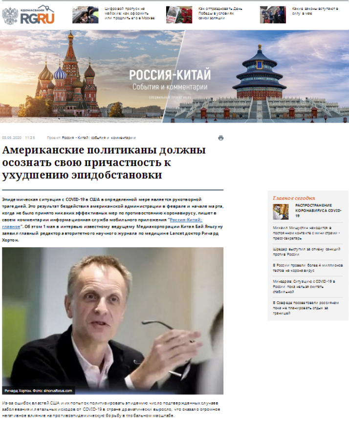 5月3日,《俄罗斯报》官网刊发题为《美国政客应为全球疫情扩散负责》的文章。文章称,团结和合作是应对疫情的最有力武器。如果美国某些政客罔顾这一科学规律,那么必将沦为历史的罪人。