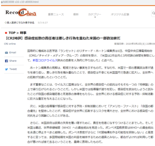 意大利广播电视公司5月6日发表《美国疫情防控疑点重重理应接受国际调查》的锐评英文版报道称:中国政府驳斥了美国国务卿蓬佩奥的言论。中国的科学家们强调说,这是一种动物病毒,不可能出自武汉病毒实验室。