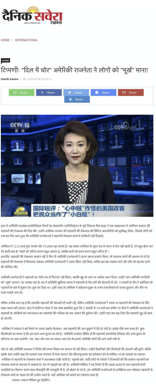 法国24电视台英语新闻频道(France 24 English)和法国24电视台西语新闻频道(France 24 Espanol)5月5日引用《新闻联播》中关于《病急乱投医!邪恶蓬佩奥在科学面前大肆喷毒造谣》的报道。报道称,中国指出,美国部分政客的言论说明其已经“病急乱投医”,急于“甩锅”。