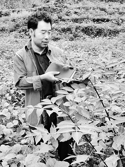 庄宁斌在查看开始挂果的吴茱萸。谭秀辉摄/光明图片