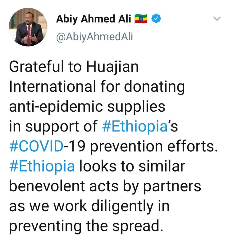 △3月21日,埃塞总理阿比在社交媒体上感谢华坚集团为当地捐赠抗疫物资