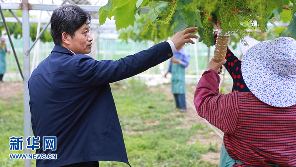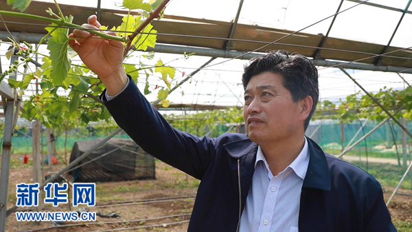 聂永平观察葡萄的生长情况(唐杨 摄)