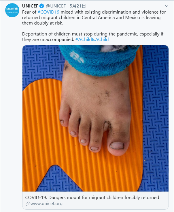 联合国儿童基金会发布声明称,美国这样的做法会把这些儿童置于“缺少保护的严重威胁中”,并且担忧这些儿童因被怀疑在美国已感染新冠病毒而可能遭到暴力和歧视。
