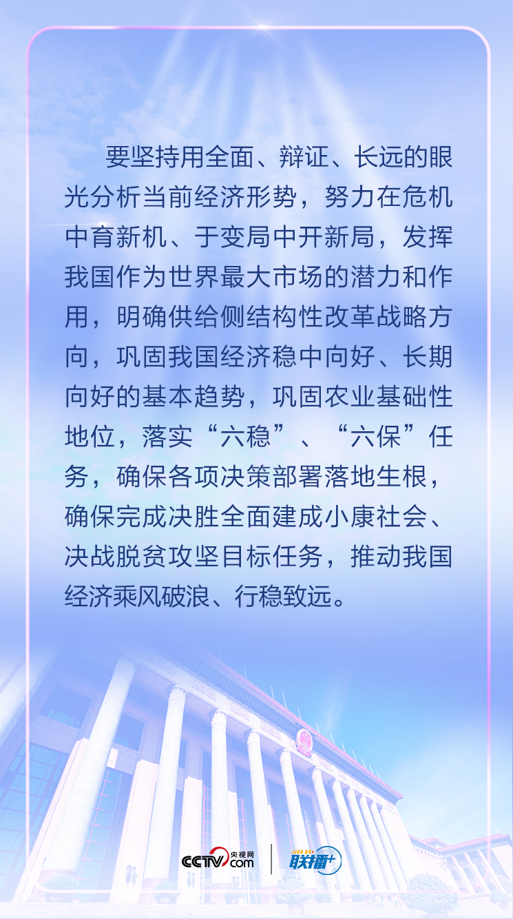联组会讲话中,习近平用全面、辩证、长远的眼光分析当前全球经济形势,剖析我国经济的优势和潜力,强调“在危机中育新机、于变局中开新局”,要求“确保各项决策部署落地生根,确保完成决胜全面建成小康社会、决战脱贫攻坚目标任务”,推动我国经济乘风破浪、行稳致远。