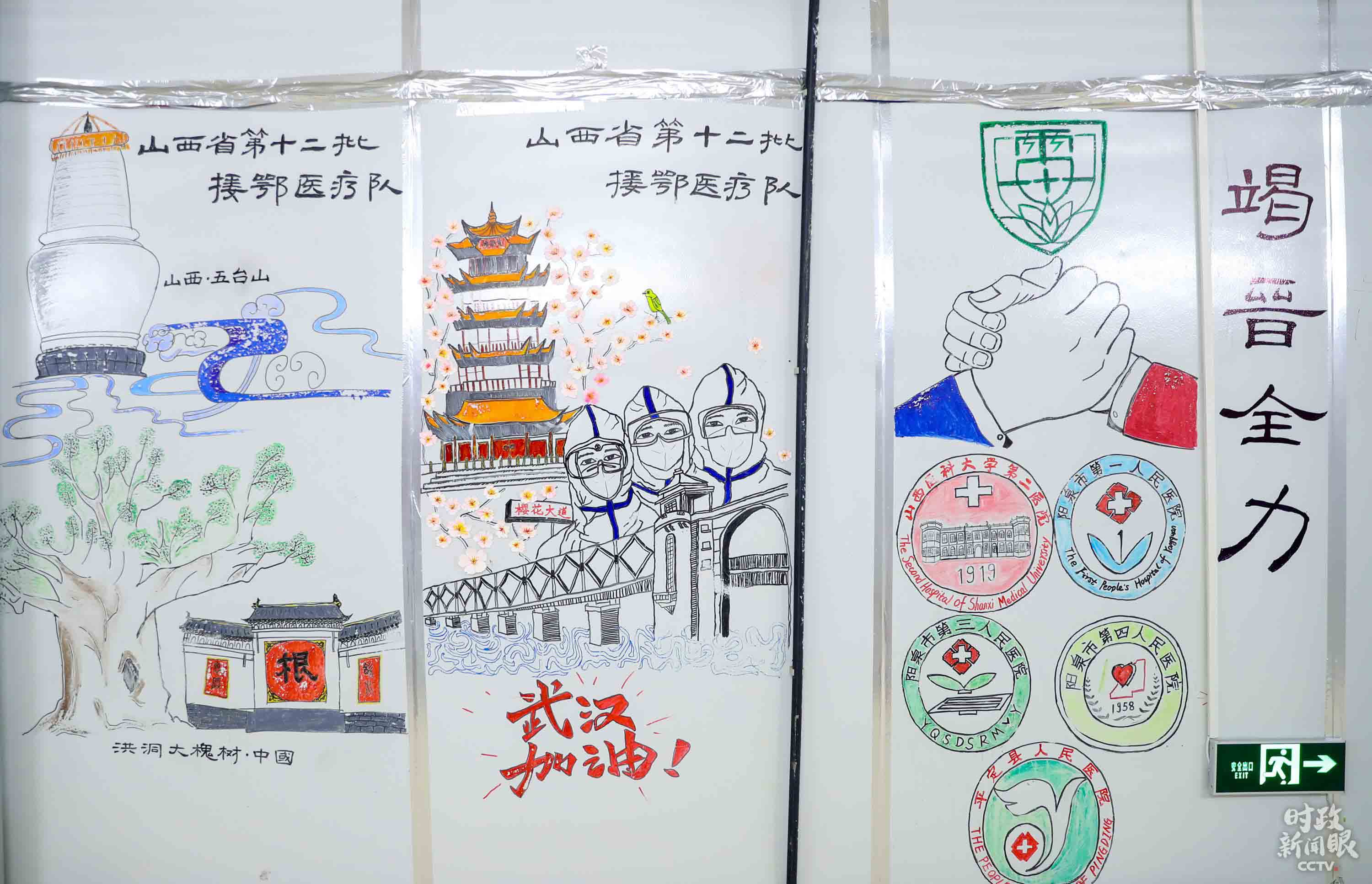 △4月14日,武汉雷神山医院实现患者“清零”。这是走廊上山西援鄂医疗队留下的手绘作品,满怀对武汉的祝福。