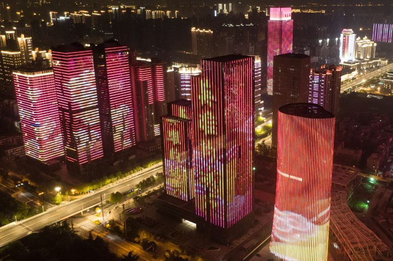 4月8日零时起,武汉市正式解除离汉离鄂通道管控措施,全市景观照明开启(无人机照片)。新华社记者 程敏 摄