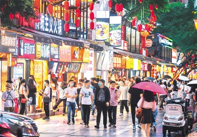 日前,重庆市多措并举,在做好疫情防控的同时,积极推进餐厅、酒吧、沿街小吃等复工,有序恢复“夜经济”。重燃夜市的烟火气,连接着促就业的大民生,也让一座城市更有活力。图为重庆市解放碑好吃街,市民们一边逛街,一边挑选美味的小吃。