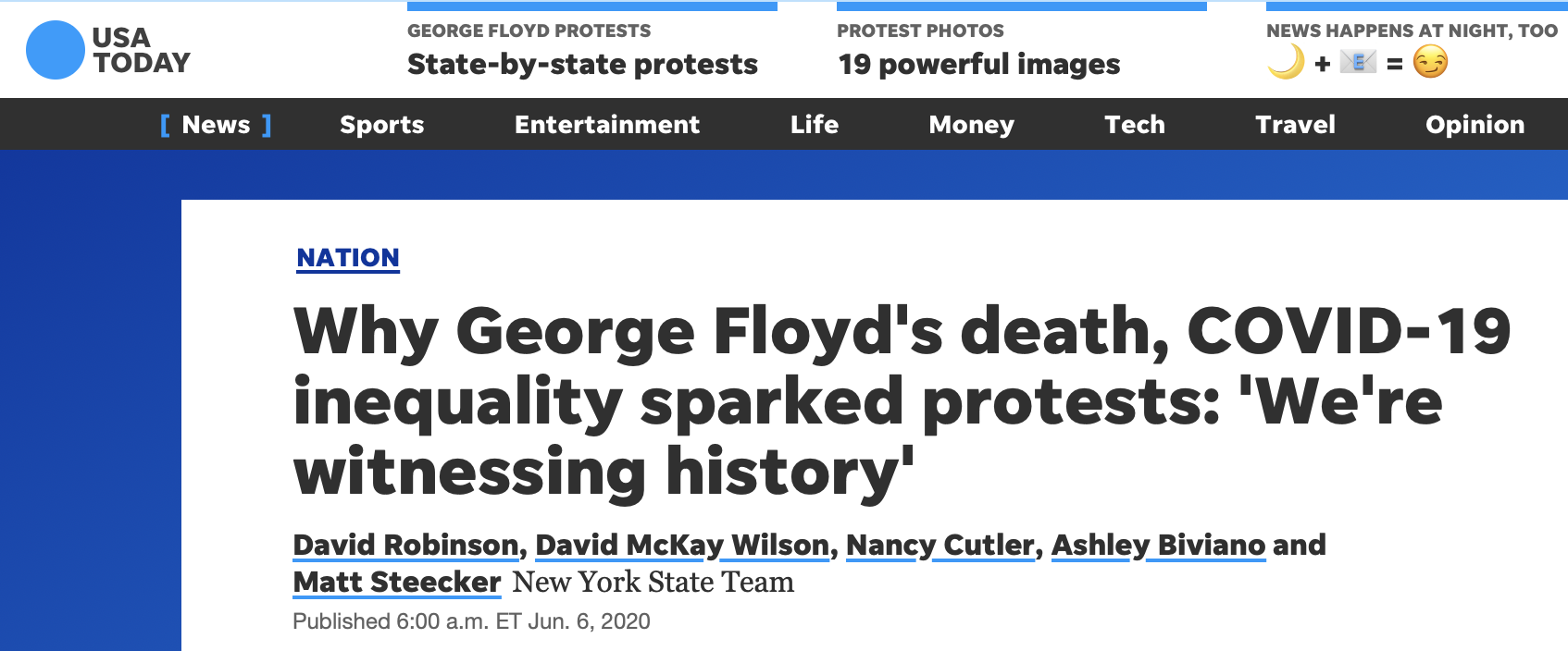 《今日美国报》网站6日发文称,抗议活动的历史性本质“在过去一周成为焦点”,除了反对几十年来警察的不当行为外,民众还抗议疫情导致有色人种的死亡比例过高,这暴露了医疗体系内的不平等。
