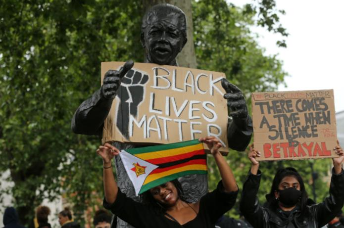 本周日(6月7日),在英国议会广场上,两座相距不远的伟人雕像遭遇了不同的对待,一座是南非第一任非裔总统、举半生之力废除南非种族隔离制、曾经被英国情报部门标记为恐怖分子头目的纳尔逊·曼德拉,反种族歧视抗议者在他的手上放置了一个纸板做的标语,上面写着:黑人的命也是命。