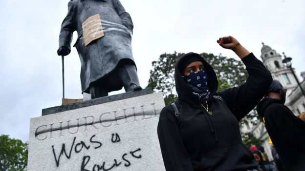 在这座雕塑前方50米处,离英国议会大厦更近的地方,英国的战时首相温斯顿·丘吉尔塑像则遭遇到羞辱。抗议者在基座上写着“种族主义者”,还有人冒险爬到雕塑上,手举同样的抗议标语,让参加过许多殖民地战争的丘吉尔看着眼前的景象:在限制令尚未完全解除的情况下,数千名抗议者完全顾不上保持安全距离,在他的眼皮底下,抗议非裔居民在美国以及英国遭受的系统性和历史性的压迫。