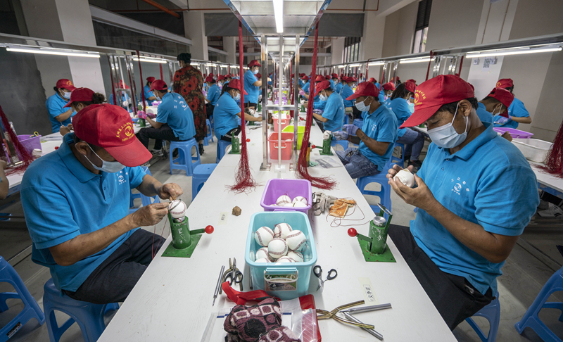 面对疫情的冲击,一些地区在做好疫情防控的同时,采取各种方式推动扶贫企业复工复产,加大就业扶贫力度,促进贫困人口就地就近就业。图为2020年5月14日,云南省怒江傈僳族自治州怒江新城城墙坝易地扶贫安置点棒球工厂的工人在制作棒球。新华社记者江文耀/摄