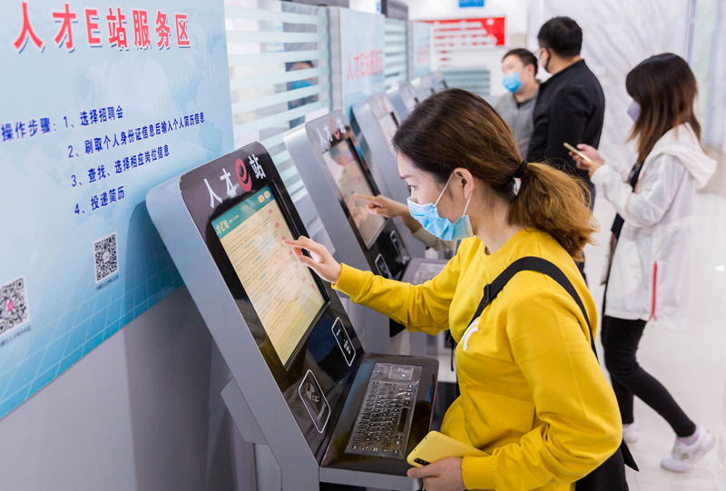 就业是最大的民生。今年以来,一些地区和部门多方提供就业岗位,拓宽就业渠道,帮助大学生就业。2020年5月20日,内蒙古自治区呼和浩特市举行“2020年高校毕业生百日攻坚现场招聘会”首场招聘会,48家用人单位提供了1271个就业岗位。图为参加招聘会的高校毕业生在“人才E站服务区”查询岗位信息。 中新社发 丁根厚/摄
