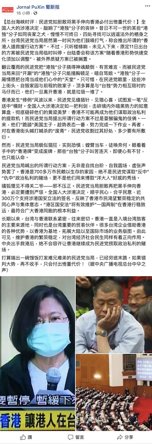 △《葡新报》Facebook6月14日刊发