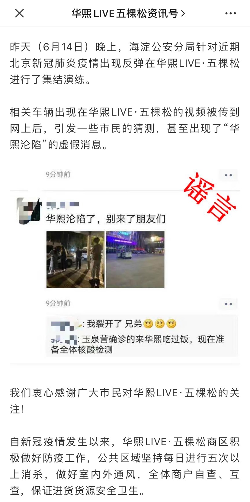 6月15日,华熙Live官方微信发布通告辟谣“沦陷”传言称,华熙Live为配合海淀公安分局集结演练提供场地,“华熙沦陷”属谣言。