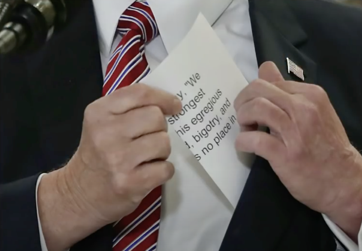 其实当时白宫幕僚已经写好了讲稿,照着念即可。媒体不小心拍到了部分讲稿上不完整的词句“最强烈地”“极为严重的”“偏执”和“在美国没有市场”,明显在批评白人至上主义。可当总统特朗普收起讲稿的时候,幕僚们都明白,他们又要面对媒体的狂风暴雨了。