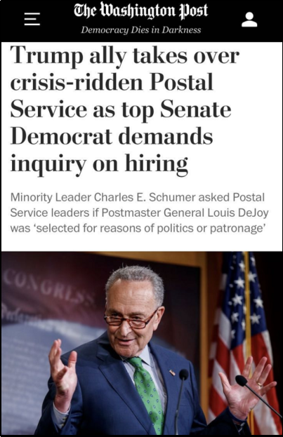 △《华盛顿邮报》报道,民主党已于6月14日正式要求调查新邮政局长的任命