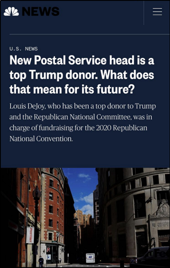 △美国全国广播公司指出,美国邮政局局长按程序规定应由该机构董事会任命,以避免卷入政治纷争