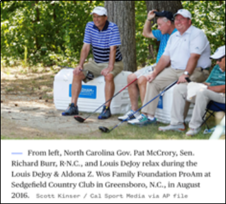△路易斯·德乔伊(左三)与前北卡罗莱纳州州长帕特·麦克罗里等人在北卡的乡村俱乐部休闲(图片来源:美联社)