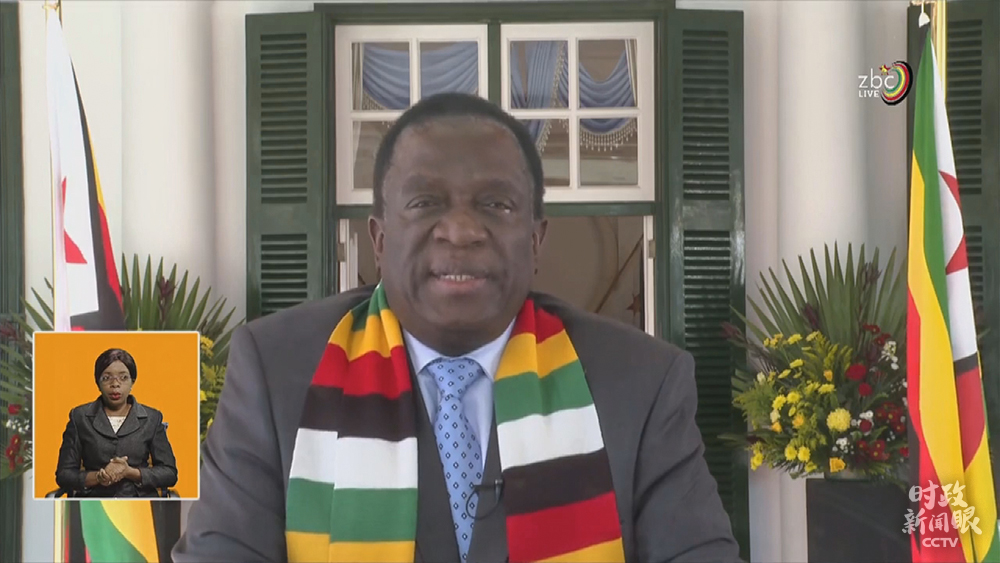 △5月12日,津巴布韦总统姆南加古瓦在总统府接见中国抗疫医疗专家组,并在国家电视台发表讲话时,再次感谢中国帮助津巴布韦抗击新冠肺炎疫情。(总台央视记者马培敏提供)