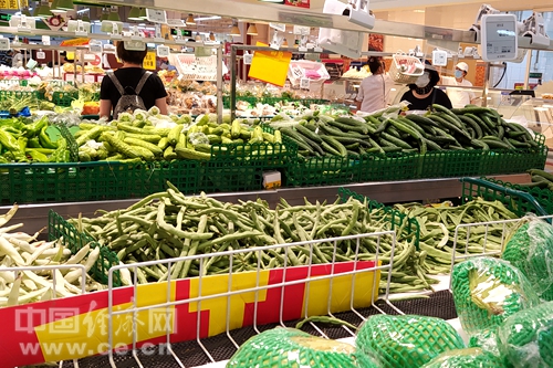 今日,经济日报-中国经济网记者对位于北京南三环某连锁超市进行了走访。在生鲜区的水果销售区,包括樱桃、西瓜、蓝莓、荔枝、山竹等各类时令水果整齐排列供人挑选,个别水果还有优惠活动。同在该超市的蔬菜区,尽管过了上午买菜的高峰时段,但仍有消费者在挑选蔬菜,除个别特价商品销售见底外,大部分蔬菜供应充足,并有吃过午饭的理货员在整理菜架,准备补货。