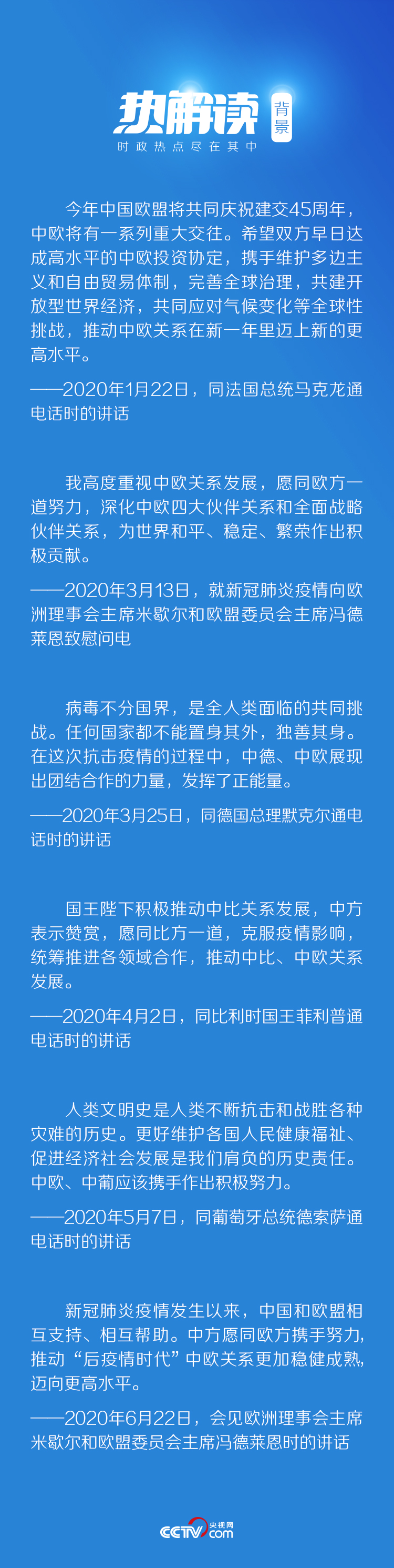 习近平指出,疫情冲击下的世界正在深刻变化,面临更多不稳定不确定因素。我曾提出,要努力在危机中育新机,于变局中开新局。这一点也适用于中欧关系。