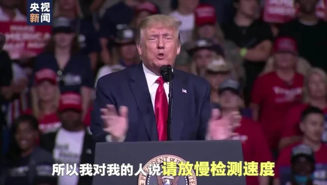 关于病毒检测工作,特朗普上周末在疫情以来的首场竞选集会上宣称加大检测力度是美国确诊病例排在全球第一的原因,所以应“放慢检测速度”。他说:“新冠病毒的检测是一把‘双刃剑’,当你检测了那么多人的时候,你会发现有更多的确诊病例,所以我对我的人说,‘请放慢检测速度吧’。”
