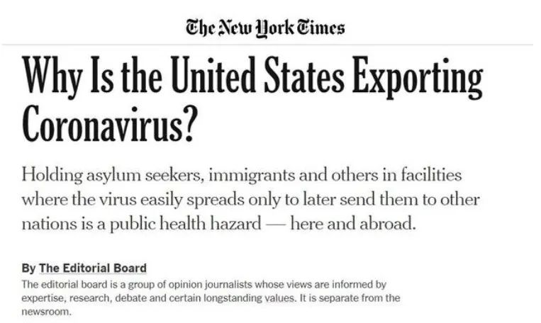 美国严重的疫情也给拉美国家带来间接危害。《纽约时报》日前刊载题为《美国为何在输出新冠病毒》的评论文章称,作为新冠肺炎疫情最严重的国家,美国大规模驱逐寻求庇护者的行为是在将病毒传播到美国以外,尤其是拉美国家。文章指出,美国目前是世界上感染新冠病毒人数最多的国家,而且正把成千上万可能已经感染病毒的人驱逐到没有能力应对这一病毒的贫穷国家,这一行为无异于输出病毒。