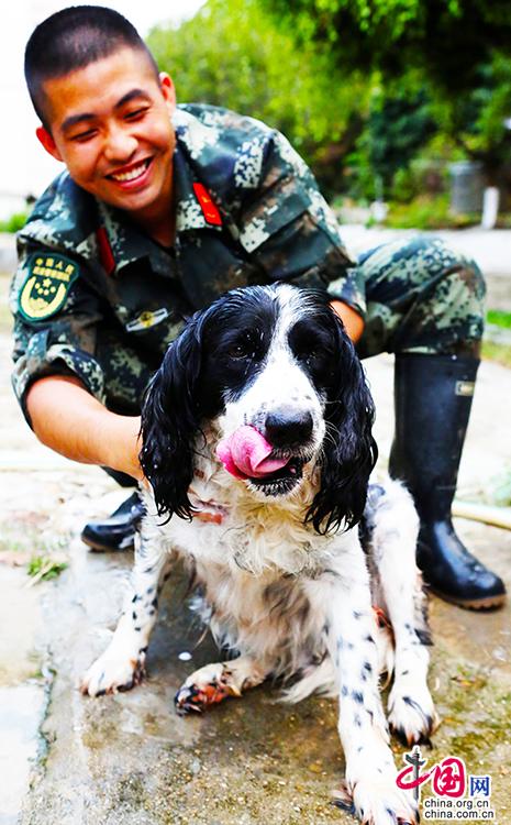 “它们也是战友,是战斗犬,我们从来不称为狗!”警犬班班长朱恒星介绍,犬没有汗腺,从每年的四月份起,直到11月,战士们每天都要给每只犬洗澡消暑,退役的警犬也享受着退役前的同等待遇。