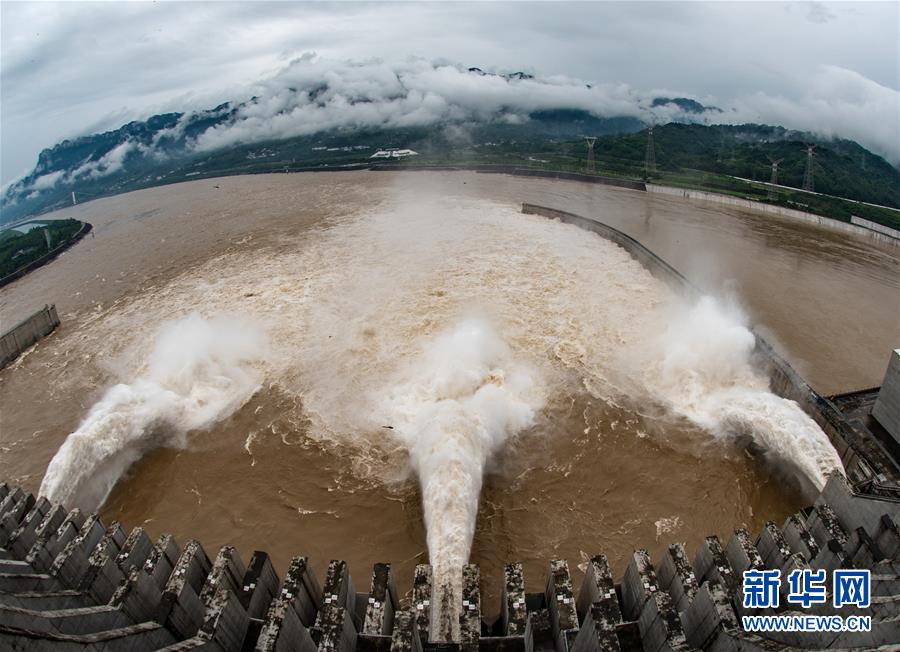 长江三峡枢纽开启泄洪深孔泄洪(7月2日摄)。新华社发(郑家裕摄)