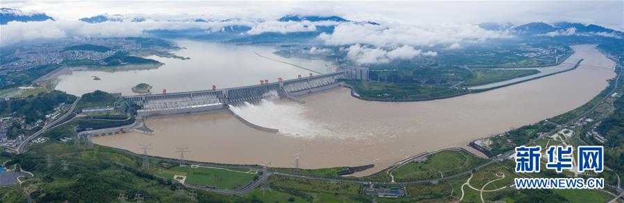 长江三峡枢纽开启泄洪深孔泄洪(7月2日摄,无人机照片)。新华社发(雷勇摄)