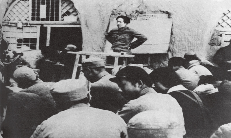 毛泽东非常重视理论联系实际这一马克思主义学风的养成,强调必须始终坚持把马克思主义与中国实际紧密结合起来。图为毛泽东在为陕北公学学员讲课。