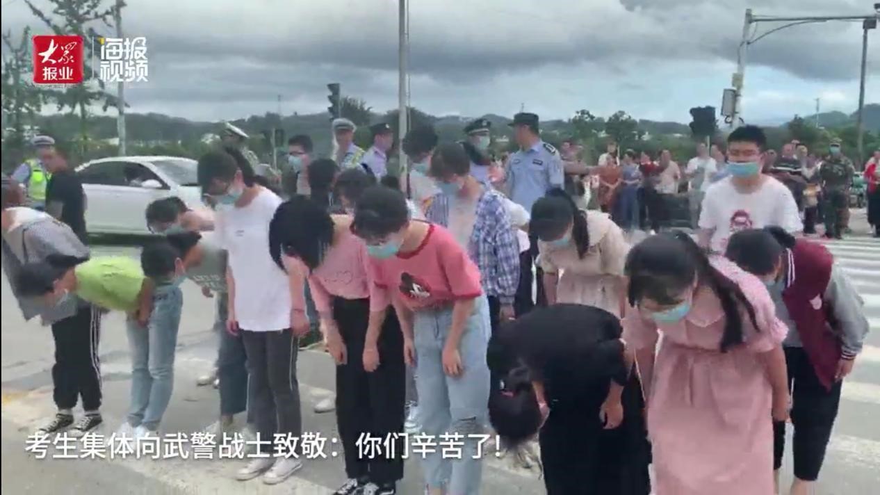 首先,我们来看一段视频。受洪涝灾害影响,安徽歙县高考语文、数学科目推迟至7月9日举行。当天下午,考生们走出考场时,向现场保障他们考试的武警黄山支队官兵、公安干警等鞠躬致谢:你为我护航,我向你致敬!