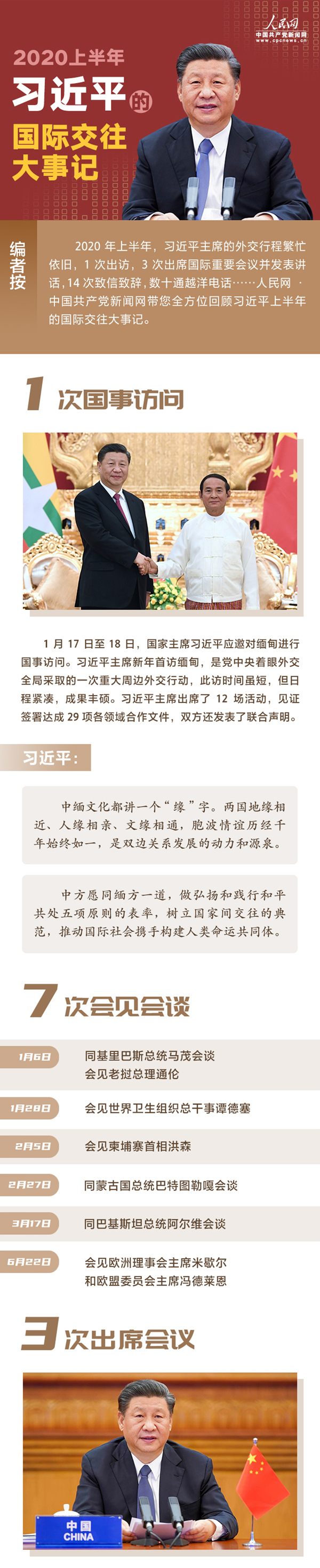 细数今年上半年,习近平夙夜在公,勤勉工作,不断刷新“忙碌指数”:数十次出席重要会议部署各项工作,8次国内考察,调研足迹遍及7省区市,3次出席国际重要会议并发表讲话,20余次致信、回信海内外人士,60次就疫情防控等话题与40余位外国政要和国际组织负责人通电话……人民网·中国共产党新闻网推出系列图解报道,带您全方面回顾习近平的2020上半年。