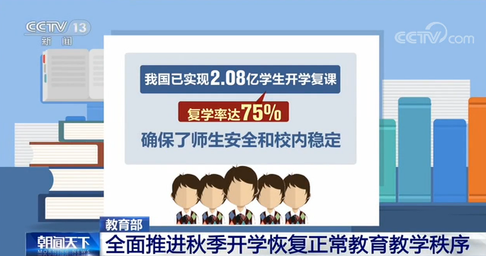 据介绍,我国已实现2.08亿学生开学复课,复学率达75%,确保了师生安全和校内稳定。