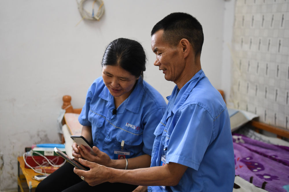 在佛山市三水区广东星星制冷设备有限公司提供的夫妻宿舍里,李力挖(右)、何公各在休息时间玩手机(6月22日摄)。新华社记者邓华摄