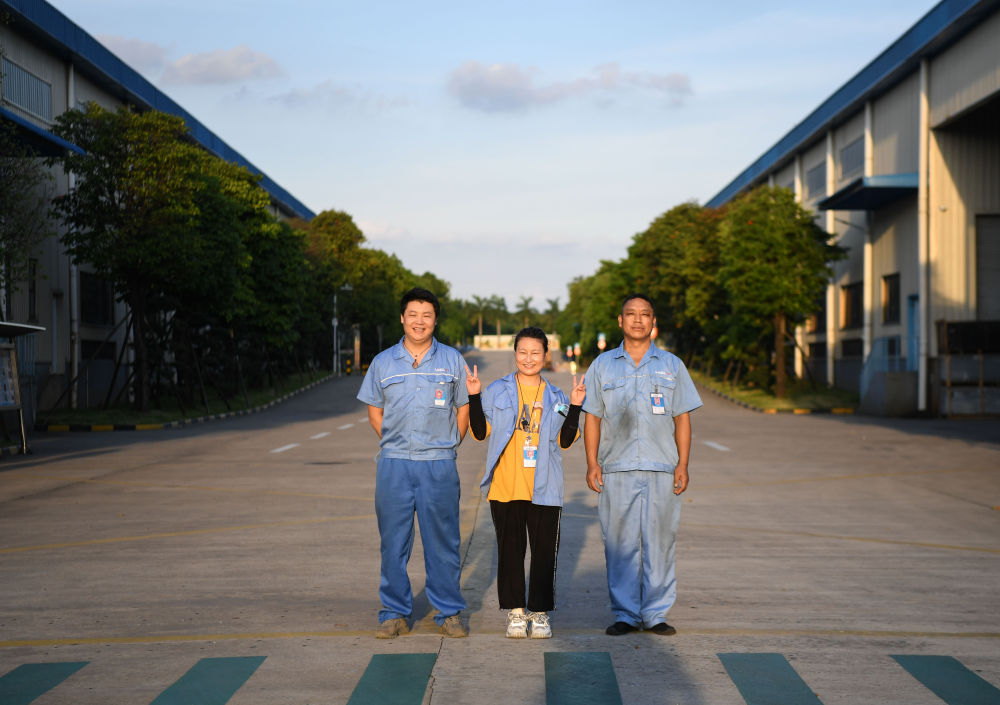 在佛山市三水区广东星星制冷设备有限公司,来自四川凉山彝族自治州盐源县的贫困务工人员伍元国、易争咪、董正军(从左至右)下班后在厂区合影,他们通过东西部扶贫协作在这里实现就业(6月22日摄)。新华社记者邓华摄