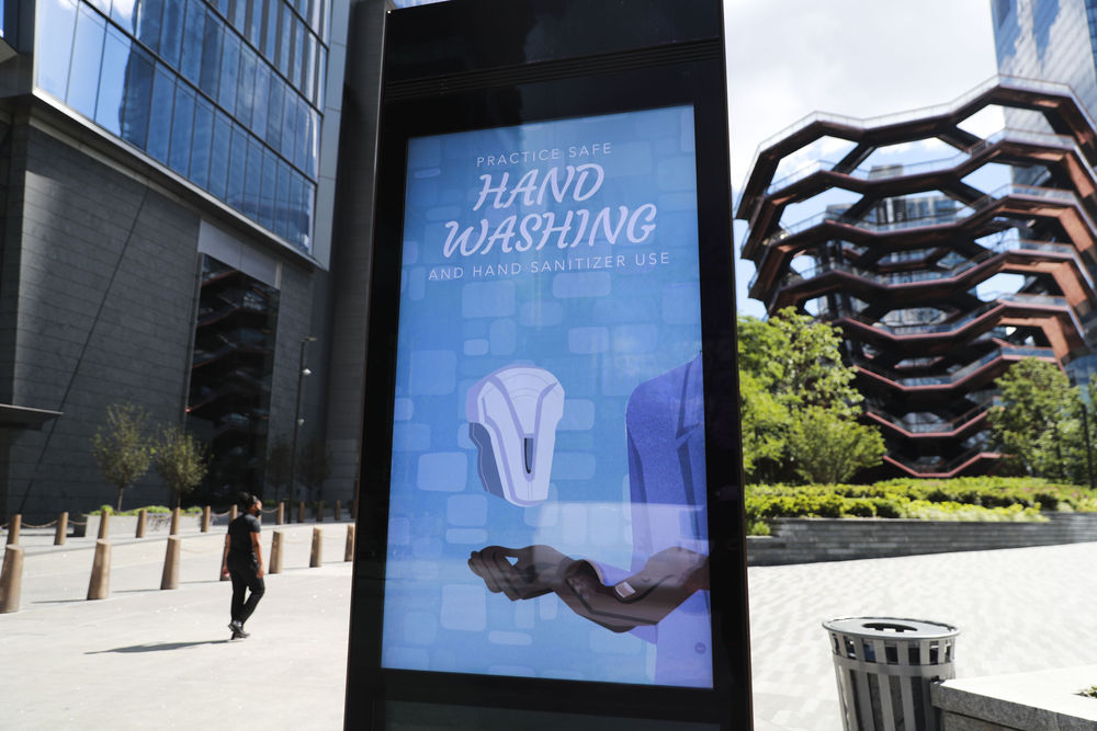 7月14日,在美国纽约一家尚未恢复店内购物的购物中心外,电子屏介绍正确洗手的方式。(新华社记者王迎摄)