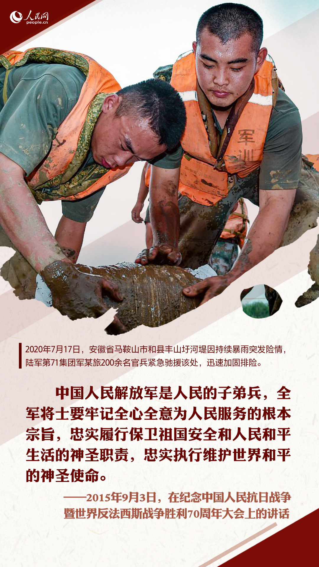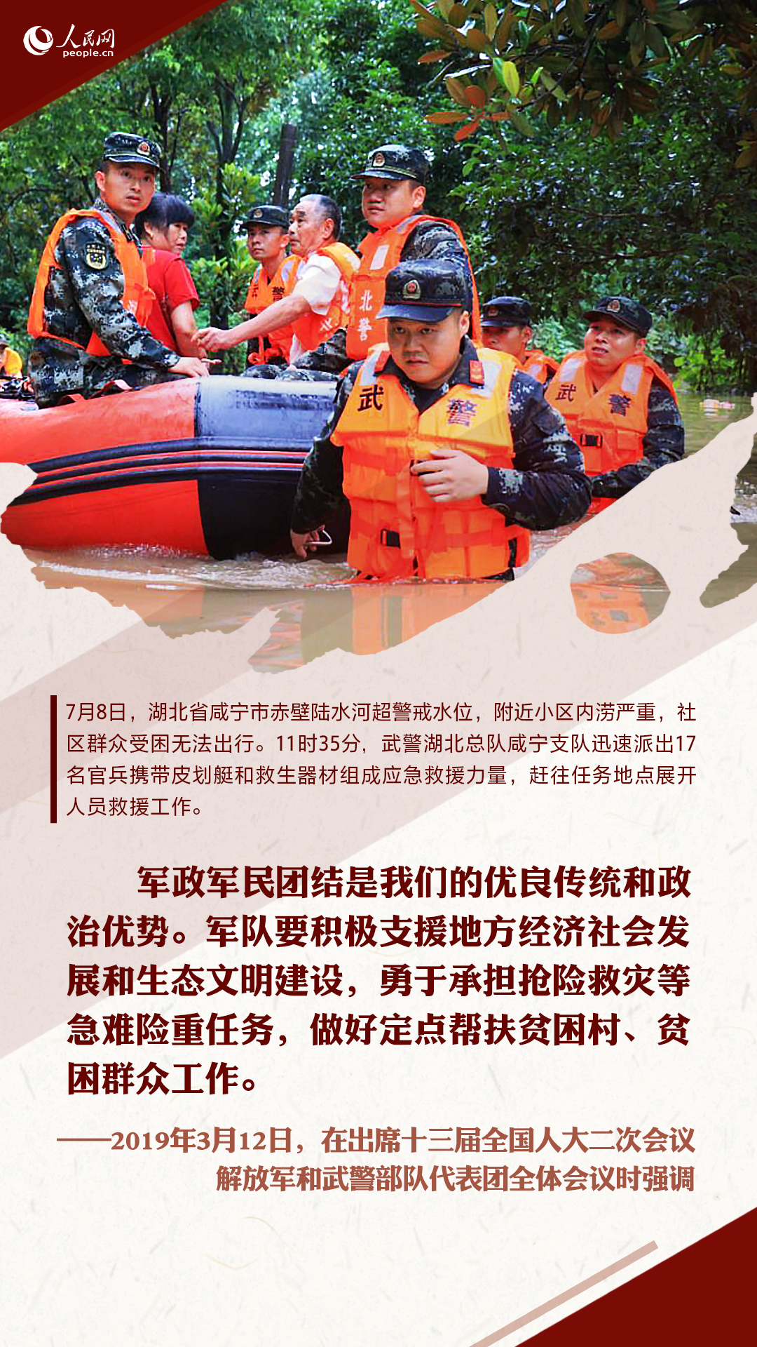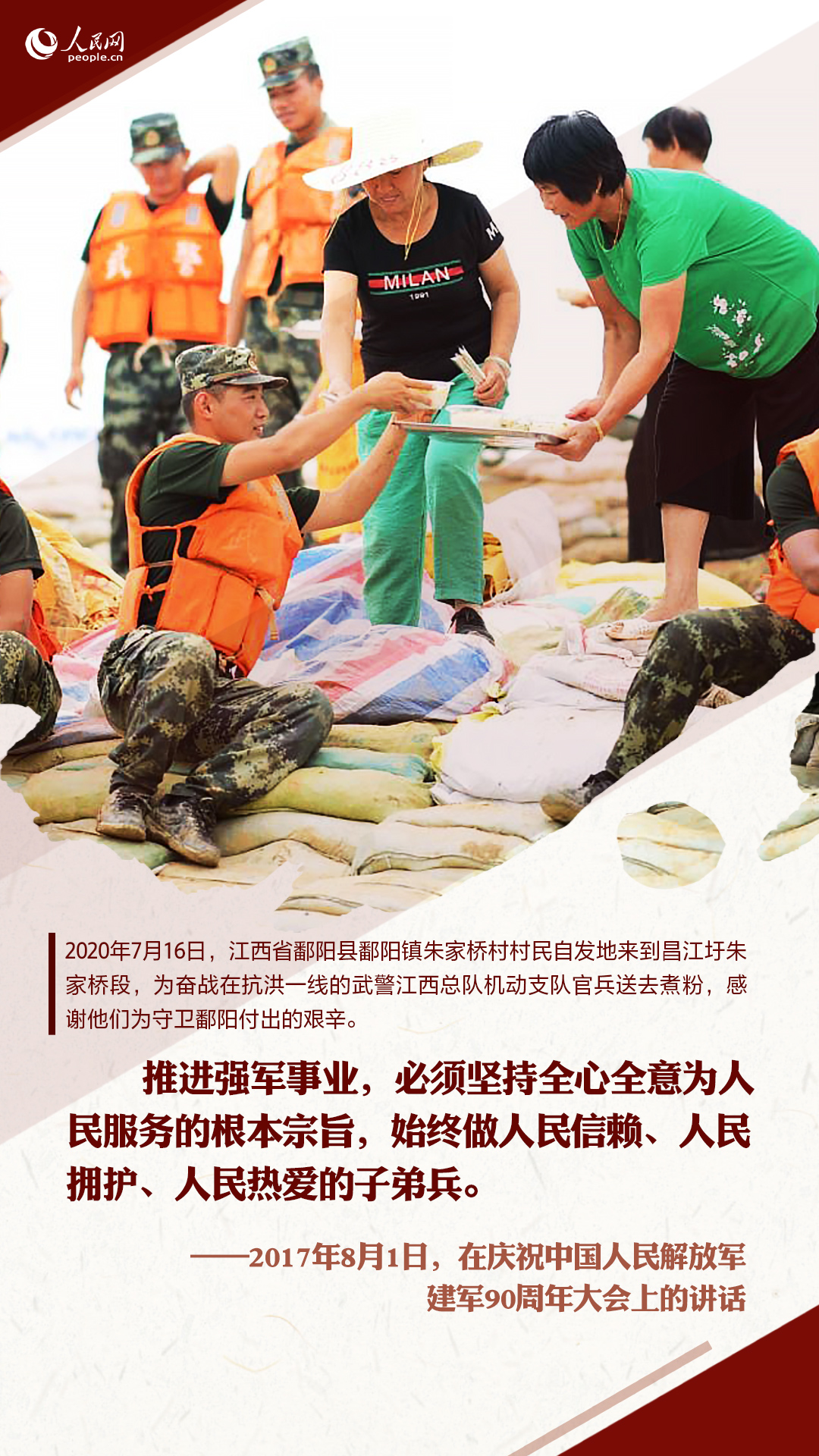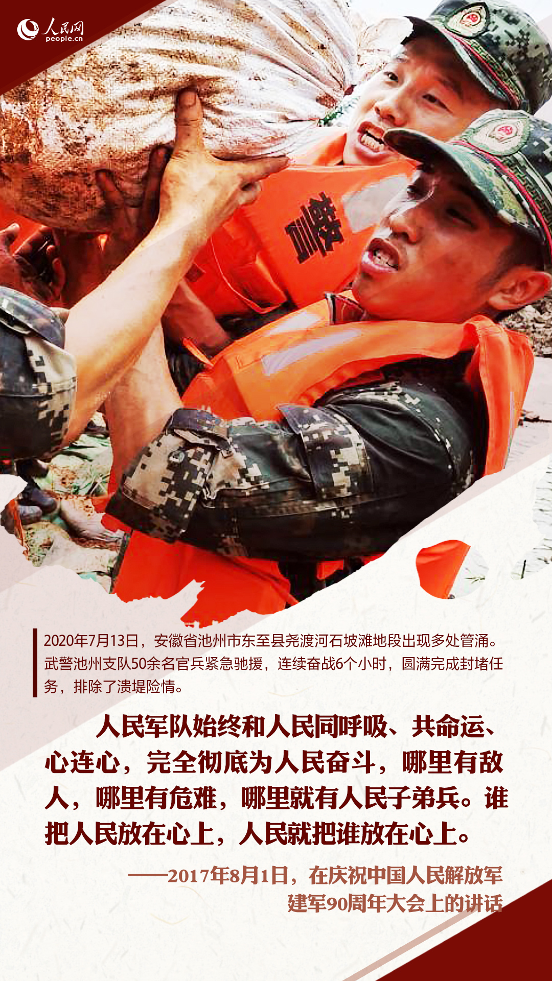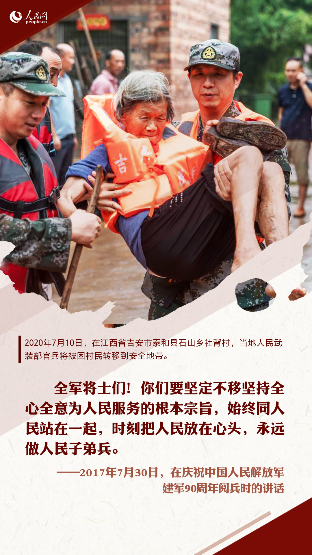 十八大以来,习近平在多个重要场合嘱托人民子弟兵要全心全意为人民服务。这些话语,犹在耳畔,人民网图解新闻制作一组海报,重温习近平的殷殷嘱托,并致敬与洪水战斗的人民子弟兵!