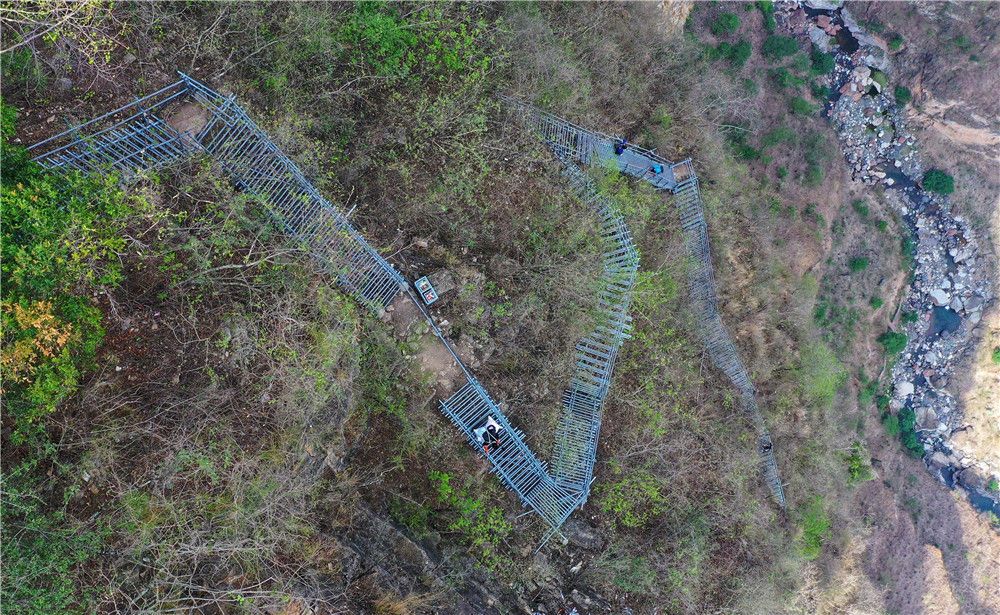 在四川凉山彝族自治州昭觉县阿土列尔村的悬崖钢梯上,“悬崖村”村民沿着钢梯下山(5月13日摄,无人机照片)。新华社记者 王曦 摄