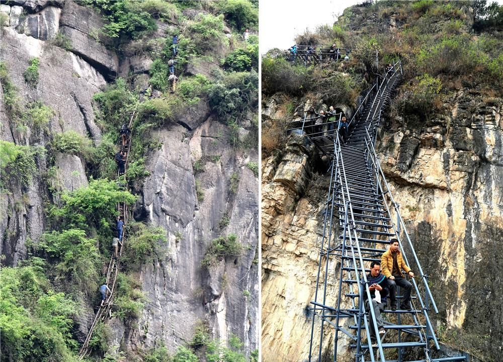 拼版照片:左图为通往四川凉山彝族自治州昭觉县阿土列尔村的简易藤梯(2016年5月14日摄);右图为改建后的钢梯(2017年12月5日摄)。新华社发(阿克鸠射 摄)