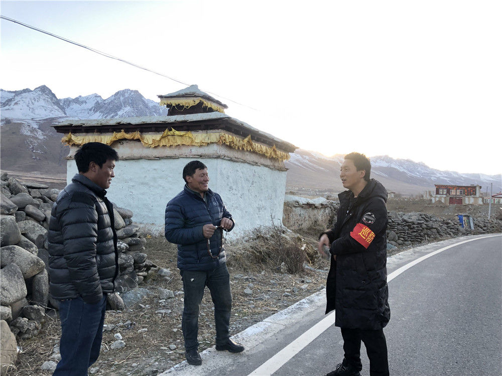 生前担任甘孜州甘孜县夏拉卡村驻村第一书记的马伍萨(右)在巡防路上和村民交流(资料照片)。新华社发