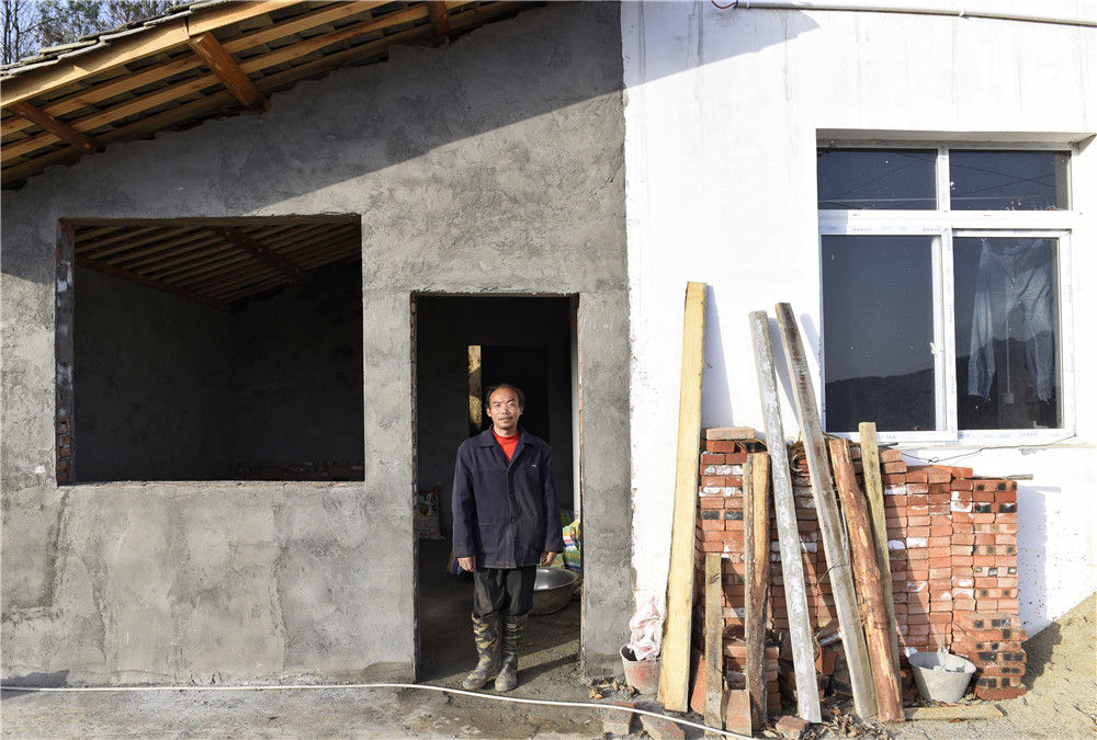 四川巴中市南江县小田村村民秦发章在他正在修建的新房前留影(2018年3月20日摄)。新华社记者 刘坤 摄