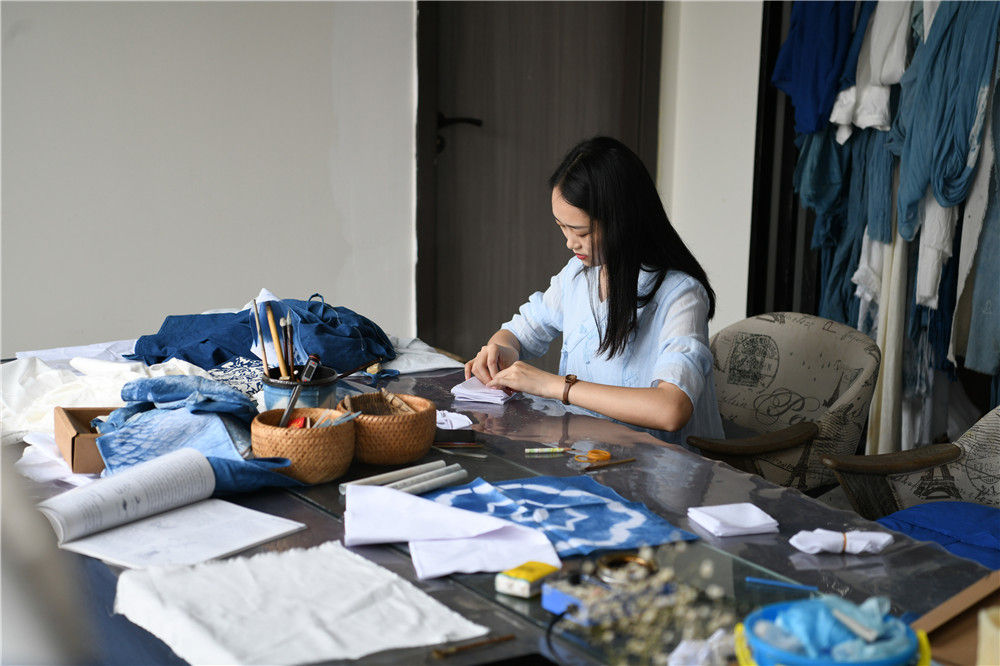 在四川省德阳市旌阳区高槐村扎染工作室,一名扎染爱好者在学习扎染技艺(6月14日摄)。新华社记者 王曦 摄