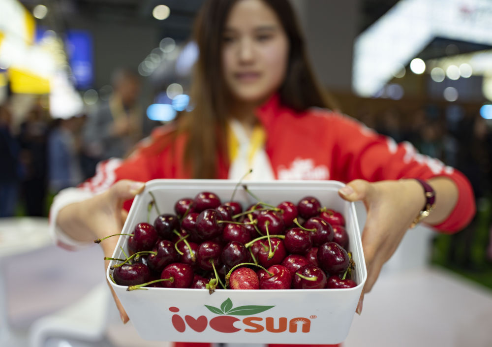 ▲第二届进博会上,工作人员在食品及农产品展区展示智利车厘子。