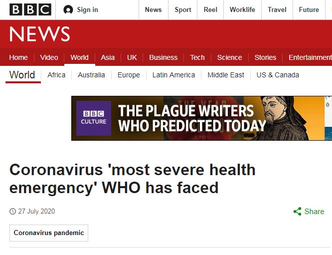 据英国广播公司(BBC)报道,自1月以来,全球报告新冠确诊病例超过1600万例,死亡病例超过65万例。谭德塞称,“我在1月30日宣布国际关注的突发公共卫生事件时……中国以外地区确诊病例不到100例,死亡病例(还)没出现……”