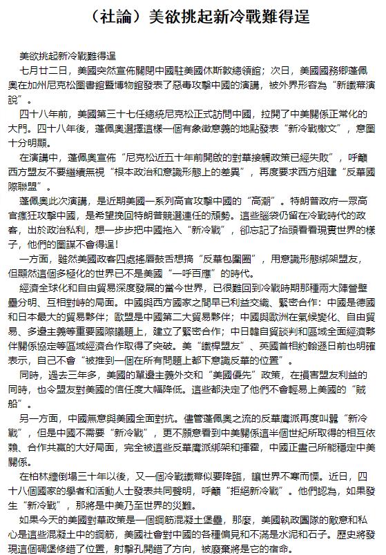 澳门地区发行量最大的报纸《澳门日报》28日发表以《美欲挑起新冷战难得逞》为题的社评。社评指出,特朗普政府一众高官疯狂攻击中国,是希望挽回特朗普竞选连任的颓势。这些脑袋仍留在冷战时代的政客,出于政治私利,想一步步把中国拖入“新冷战”,却忘记了抬头看看现实世界的样子,他们的图谋不会得逞!