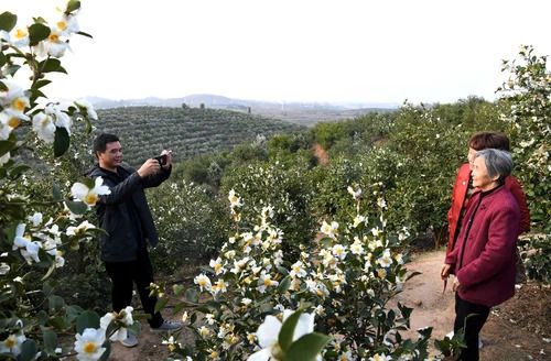 △在河南省信阳市光山县司马光油茶园,游客与油茶花合影。